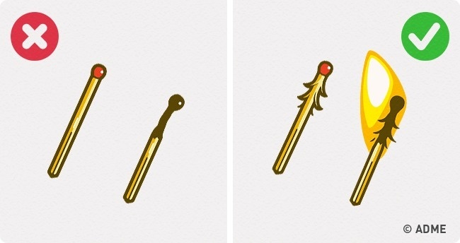 Запалити сірник не складно, складніше утримати на ній полум'я. Щоб випадковий протяг або вітерець не погасив вогонь, перед запалюванням нарізати стружки по напрямку до сірчаної голівці. Полум'я буде більш сильним, і його складніше буде погасити.