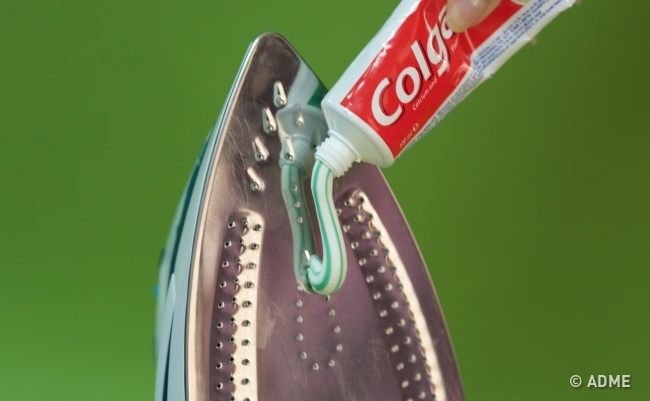 Нагар з підошви праски можна легко відчистити за допомогою зубної пасти. Злегка розігрійте праска, відключіть його від мережі, а потім нанесіть трохи пасти на забруднені місця і потріть їх за допомогою м'якої зубної щітки. Потім протріть праска серветкою, щоб прибрати залишки пасти.