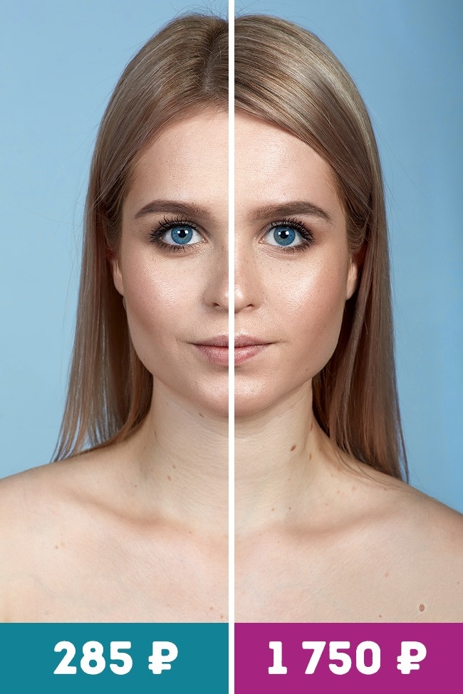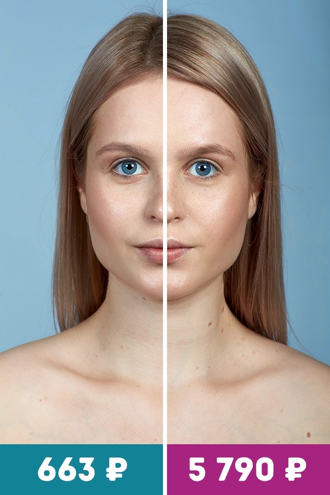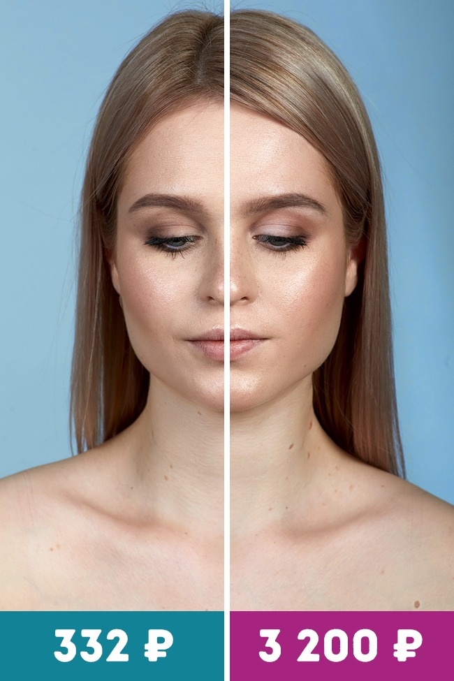 Скульптурирующие тіні Rimmel в отттенке 003, як і брендова версія, не рыжат і не лягає плямами, тому обидві сторони виглядають природно. Бюджетні рум'яна фірми Bell погано розподіляються пензлем, але при цьому володіють красивим кольором. В якості освітлення з більш низькою ціною використовувалися запечені тіні для повік Pupa у відтінку 201, які надають шкірі свіжий і здоровий вигляд.