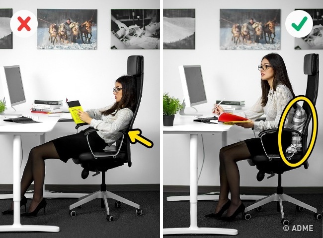 Глибина крісла повинна відповідати довжині вашого стегна. Якщо ви сидите на дуже великому стільці, покладіть подушку під поперек, вона візьме частину навантаження на себе. Інакше ви будете скочуватися назад, це призведе до напруження і болю в спині.