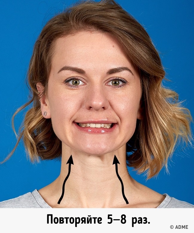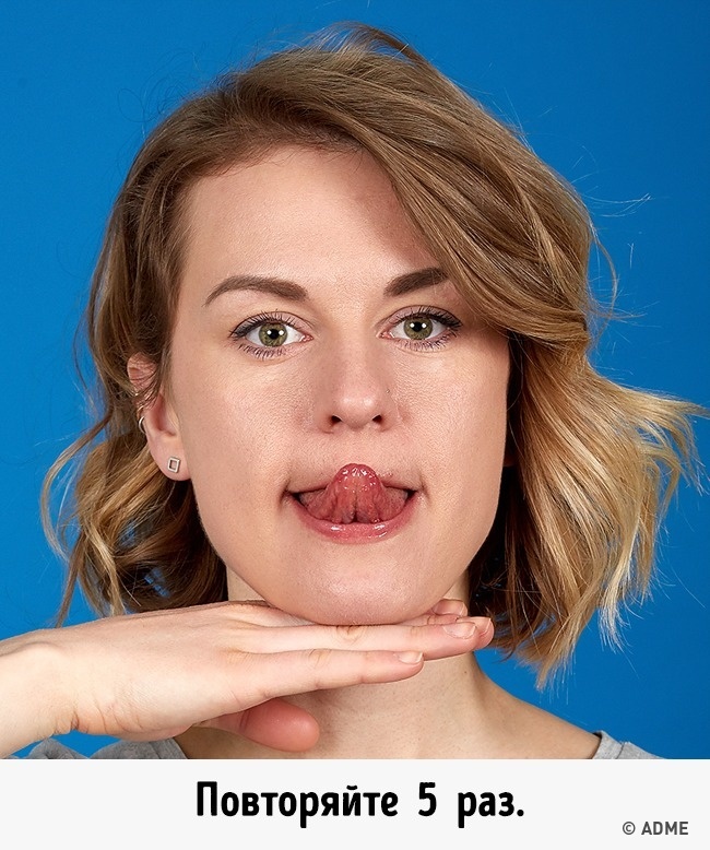 Щоб зберегти овал обличчя, підтягнути щоки, виконуйте наступну вправу: поверніть голову вліво, з напругою висуньте вперед нижню щелепу. Ви повинні відчути, як напружилися м'язи на шиї з лівого боку. Тепер повторіть в іншу сторону. Для кожної сторони виконуйте по 5 разів.