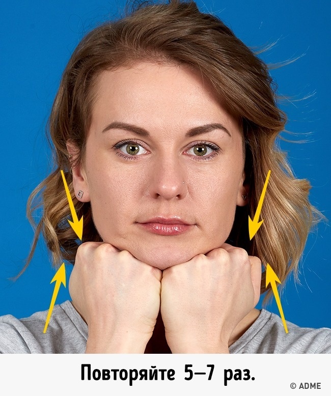 Заповніть рот повітрям, щільно зімкніть губи і щоки роздмухати. Тепер долонями натисніть на щоки так, щоб відчувалося напруження м'язів. Докладаючи максимум зусиль, затримайтеся на 3-5 секунд, після чого випустіть повітря і розслабтесь. Повторіть вправу 5-6 разів.
