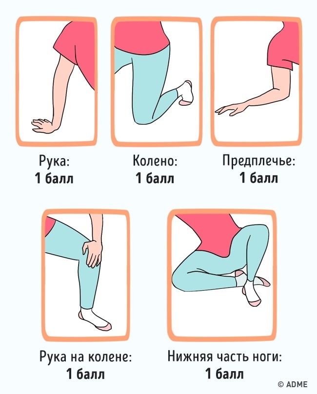 На самому початку у вас є 10 балів. Відніміть 2 бали за кожне використання опори, 1 бал за легкі труднощі (наприклад, втрату рівноваги), 2 бали за невдалу спробу сісти або встати.