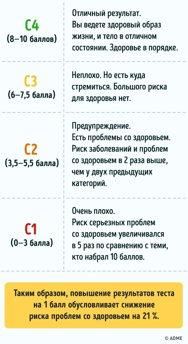 Тим не менш оцінити своє здоров'я цікаво кожному. Люди з перших двох категорій можуть бути спокійні. Але, якщо ви опинилися в нижній групі, краще всерйоз задуматися про своє здоров'я. Втім, піклуватися про здоров'я необхідно постійно.