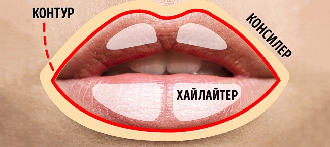 Нанесіть контур олівцем по колу і на середину губ, потім нафарбуйте помадою. Після цього нанесіть консилер навколо губ і хайлайтер, як показано на фото, щоб створити ефект пухких губ.