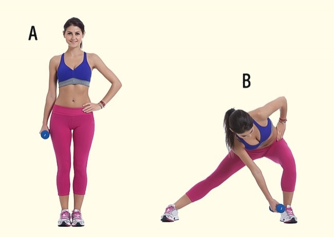 Намагайтеся робити випад глибше, прагнучи згинати ногу під прямим кутом. Замість гантелей можна використовувати пляшки з водою по 0,5 л.