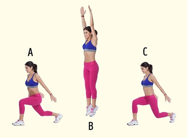 - В польоті міняємо ноги і приземляємося в випад, поставивши вперед праву ногу.