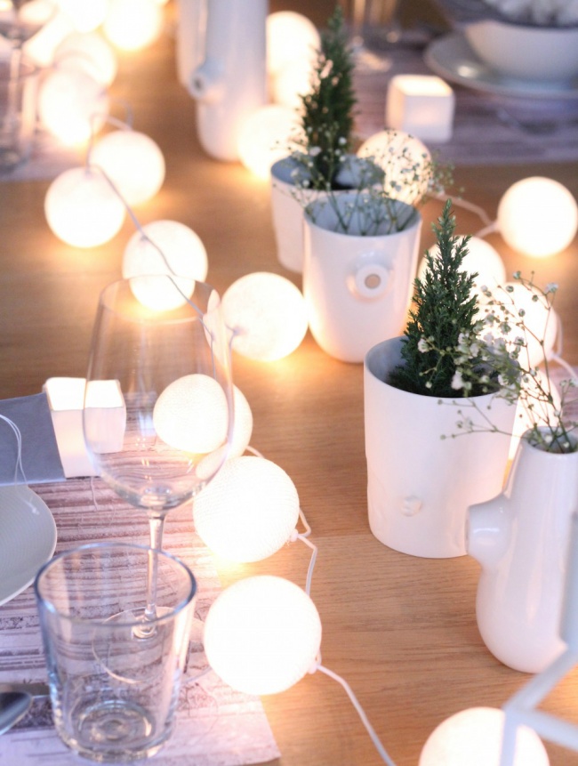 Крім сервірування варто подумати і над прикрасою святкового столу. Воно не повинно бути громіздким і привертати до себе багато уваги. Добре підійдуть свічки, острівці зимової зелені або незвичайні світлові гірлянди.