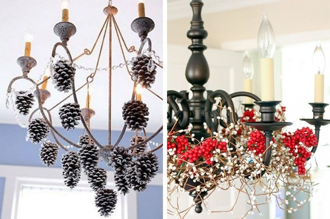 Практично будь-яка люстра зможе вписатися в новорічний вигляд вашого житла, якщо правильно підібрати для неї оформлення. Шишки, соснові або ялинові гілки, кульки здорово допоможуть у цій справі.