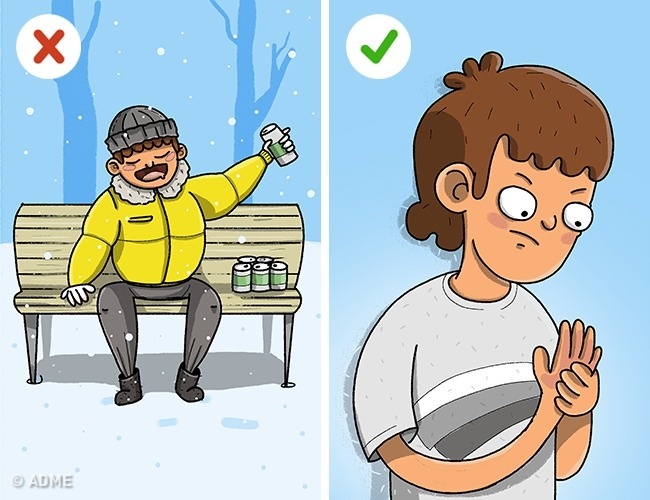 Спиртні напої значно знижують відчуття холоду і не дадуть вам вчасно відчути, наскільки ви замерзли. До того ж це може перешкодити контролю над процесом загоєння: у міру зігрівання повинно з'явитися відчуття поколювання і печіння. Шкіра на обморожених ділянках спочатку повинна стати рожевою або червоною, можливо, з плямами. Поступово повинні повертатися звичні відчуття і нормальна текстура шкіри.