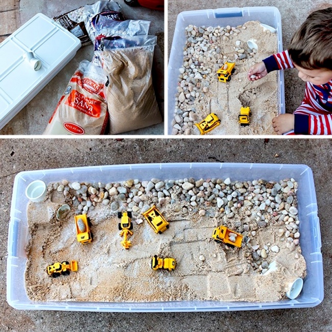 А такий піщаний бокс для будівельної техніки сподобається хлопчикам. Спробуйте зробити для них такий кар'єр і побачите, як зрадіє дитина загрібати в самоскид справжній, а не уявний матеріал.
