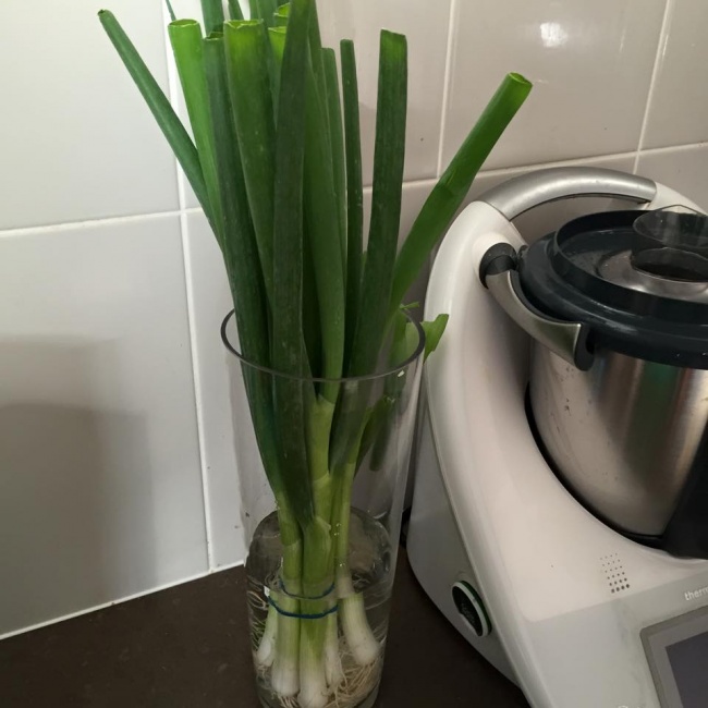 Зелена цибуля може залишатися свіжим набагато довше, якщо зберігати його в банку з водою. Обріжте цибулю там, де вам потрібно, і він буде продовжувати рости.