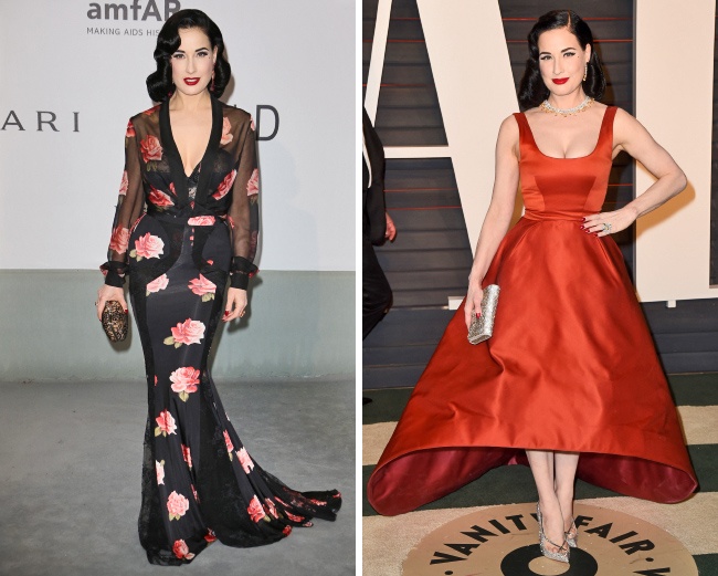 В одязі Діта фон Тіз віддає перевагу виключно суконь і спідниць в стилі ретро, за рахунок яких завжди виглядає дуже жіночно. Плюс червона помада, стрілки, палкі чорні волосся, укладене хвилями, і ось він, фатальний, сексуальний образ. Навіть у повсякденному житті вона не розлучається з високими підборами, надаючи перевагу здебільшого тонку шпильку.