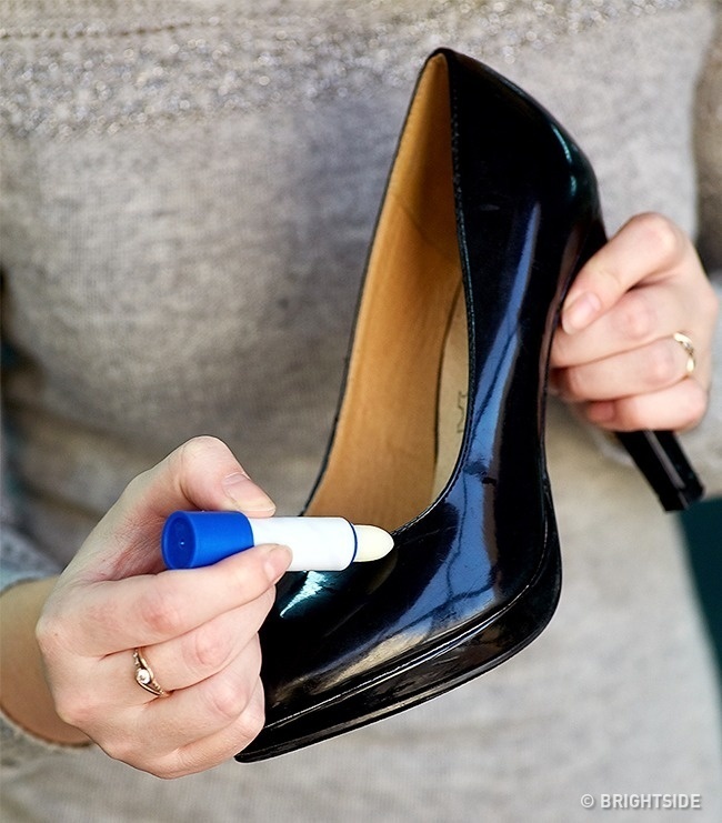 Якщо на вашій взуття з'явилися невеликі подряпини, скористайтеся бальзамом для губ. Ви також можете випробувати цю хитрість на своїх сумках, ременях, меблів або на будь-якому іншому предметі, який через подряпин став виглядати потертим, тьмяним і старим.