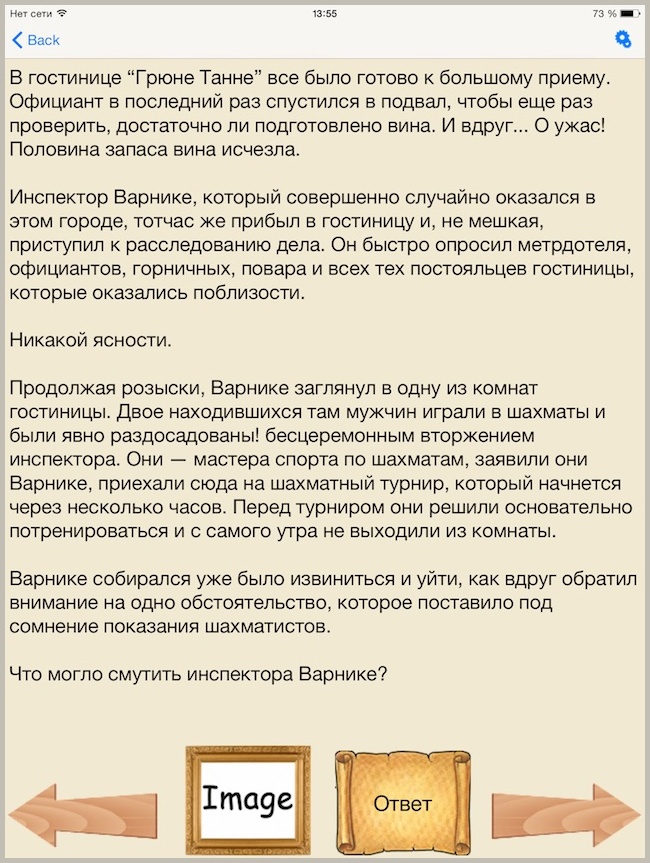 Навчіться правильно мислити і міркувати, а також перевірте свою спостережливість, намагаючись вирішити захоплюючі і заплутані злочини. В більшості випадків відповідь на питання криється в картинці, що пояснює дію, описане в тексті.