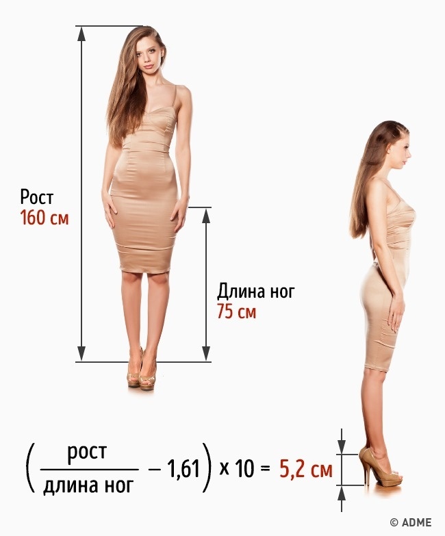 Суть формули полягає в тому, що ідеальний каблук — це «надбавка» до довжини ніг, щоб вийшло ідеальне співвідношення довжини ніг і зростання — 1,61.