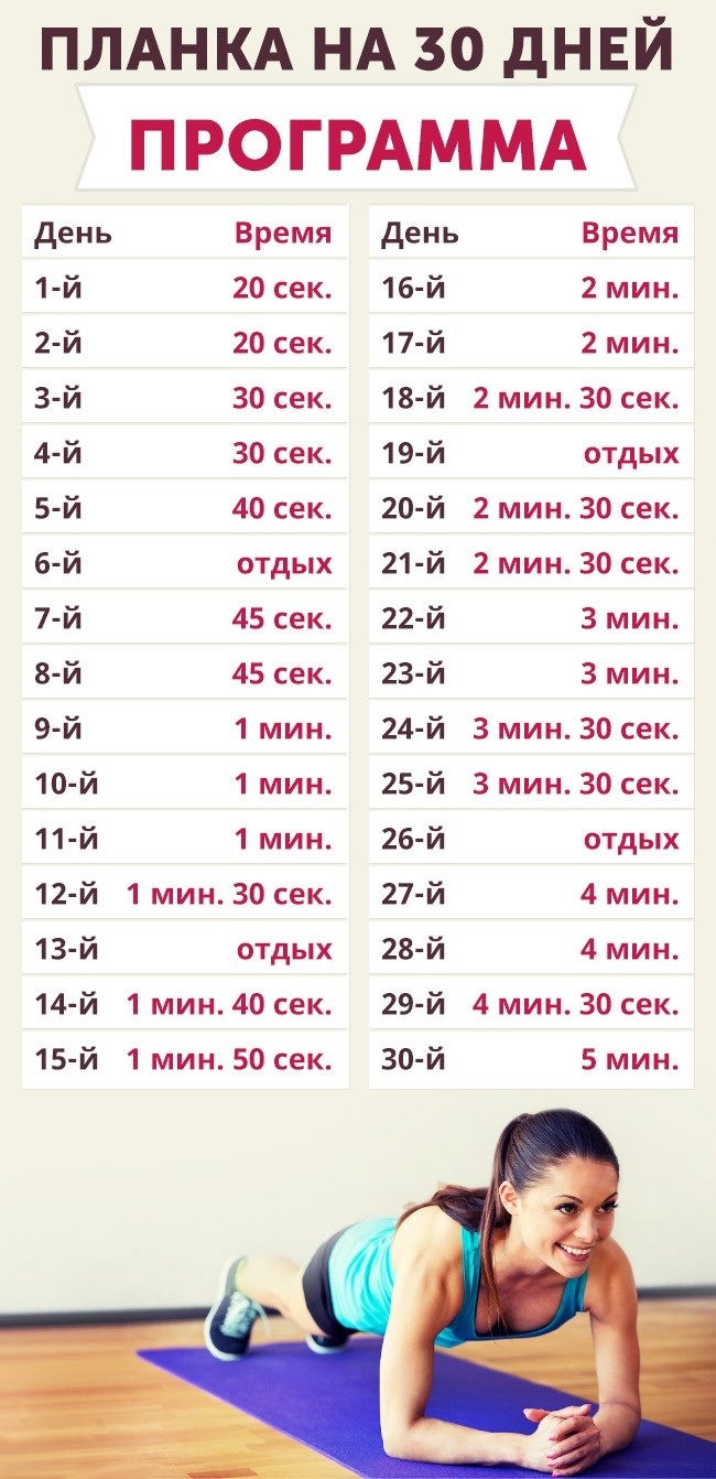 Завдання полягає в тому, щоб виконувати 1 вправа на день протягом певної кількості часу — від 20 секунд в 1-й день до 5 хвилин на 30-й день.