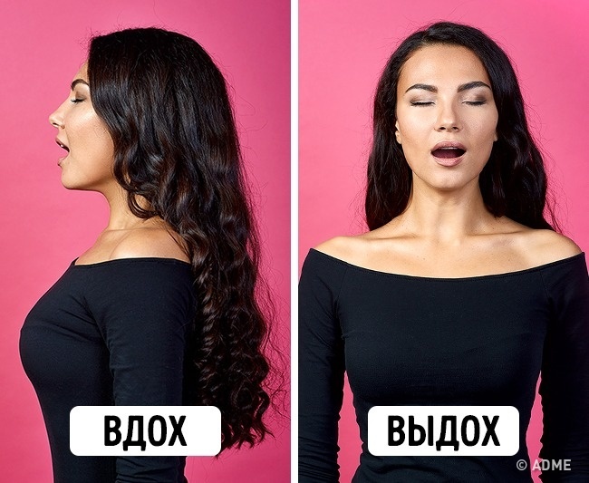 Тут потрібно викликати штучну позіхання. Відкриваючи рот максимально широко, щоб відчувалося напруження нижньої щелепи, зробіть плавний вдих — відчуйте, як легені наповнюються повітрям. На 2 секунди затримайте дихання, а потім розмірено і неквапливо видихніть.