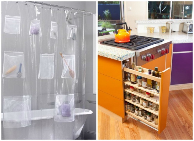 Додаткові місця для зберігання речей можна влаштувати практично де завгодно, навіть на фіранки для душу. Інструкцію ви знайдете тут.