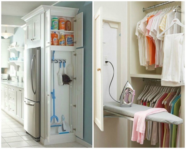 Не біда, якщо у вас немає комори або пральні і нікуди поставити окремий шафа для швабр, щіток та іншого інвентарю, — вихід є завжди. Наприклад, прасувальну дошку можна замаскувати під дзеркало.