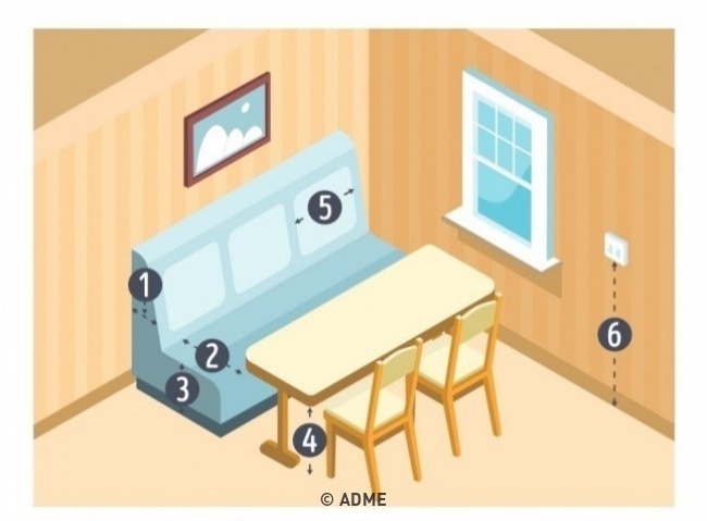 6. Проходи на кухні — не те ж саме, що робочий простір для кухаря. Мінімальна ширина проходу 90 см, в той час як робочий простір для однієї людини — до 110 див. Столову зону (якщо вона є) усередині оформляють по-різному, але розмір проходу між людиною за обіднім столом і стіною повинен становити не менше 80 див.