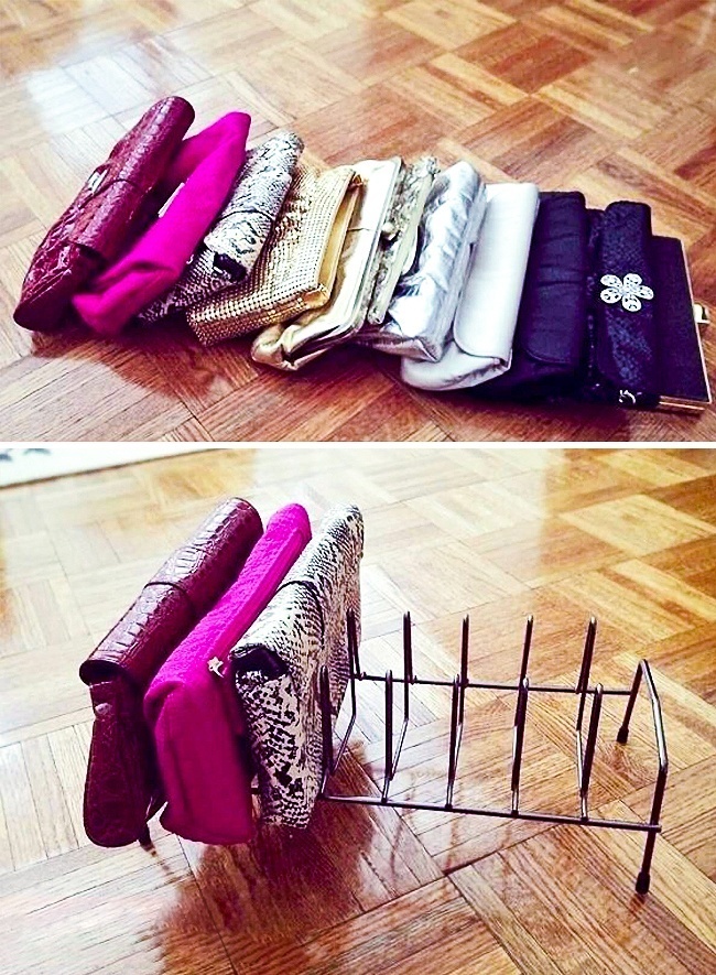 Клатчі можна розмістити у простій підставці для кришок, а потім прибрати її в шафу. Подивіться, як це зробили ось тут.