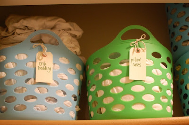 Зберігати білизну можна і в пластикових кошиках. Розсортували, підписали і прибрали в шафу — краса. Ось як тут.