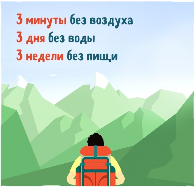 Багато досліджень показали, що зазвичай люди можуть обходитися 3 хвилини без повітря, 3 години без даху над головою в екстремальних погодних умовах, 3 дні без води і 3 тижні без їжі.