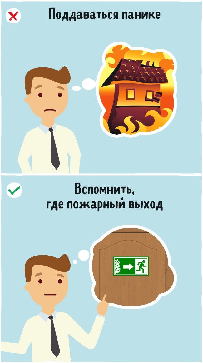 Дуже часто вперше опинившись в умовах надзвичайної ситуації, люди впадають в ступор і нічого не роблять. Фахівці радять насамперед уважно вивчити розташування пожежних виходів у приміщенні, в якому ви плануєте перебувати тривалий час.