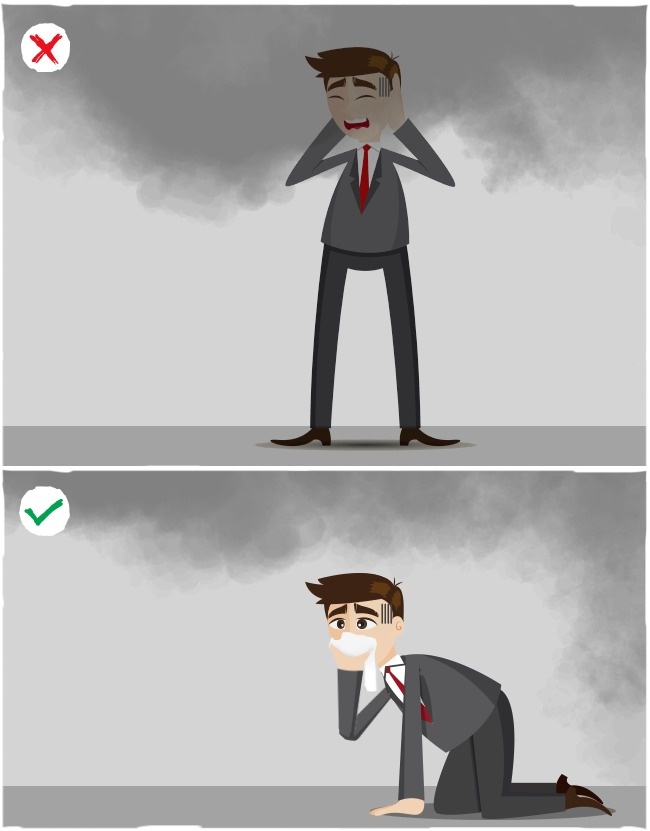 Фахівці відзначають, що найбільша кількість небезпечних травм при пожежі викликаний вдиханням диму і чадного газу, а не опіками. Уникнути отруйних парів ви зможете, якщо опустіться максимально близько до підлоги або землі і будете пересуватися таким чином по всій території пожежі.