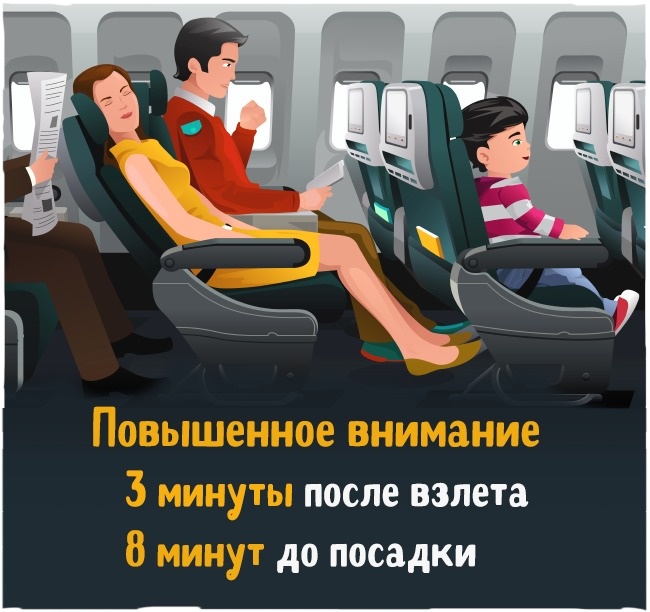 За словами дослідників, саме в цей час трапляється 80 % авіакатастроф. Будьте особливо уважні протягом трьох хвилин після зльоту і восьми хвилин до посадки літака.