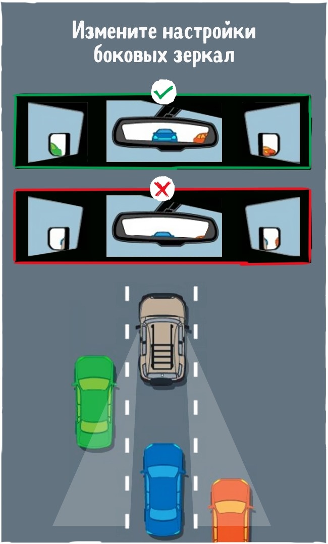 Налаштуйте автомобільні дзеркала так, щоб ви ледве бачили краю власної машини. Таким чином ви зможете ефективно усунути «сліпі плями» в бічних зонах. Через дзеркало заднього виду ви повинні завжди бачити будь-який автомобіль, який їде позаду вас. Для того, щоб регулювання дзеркал була максимально ефективною, робіть це, перебуваючи безпосередньо на місці водія.