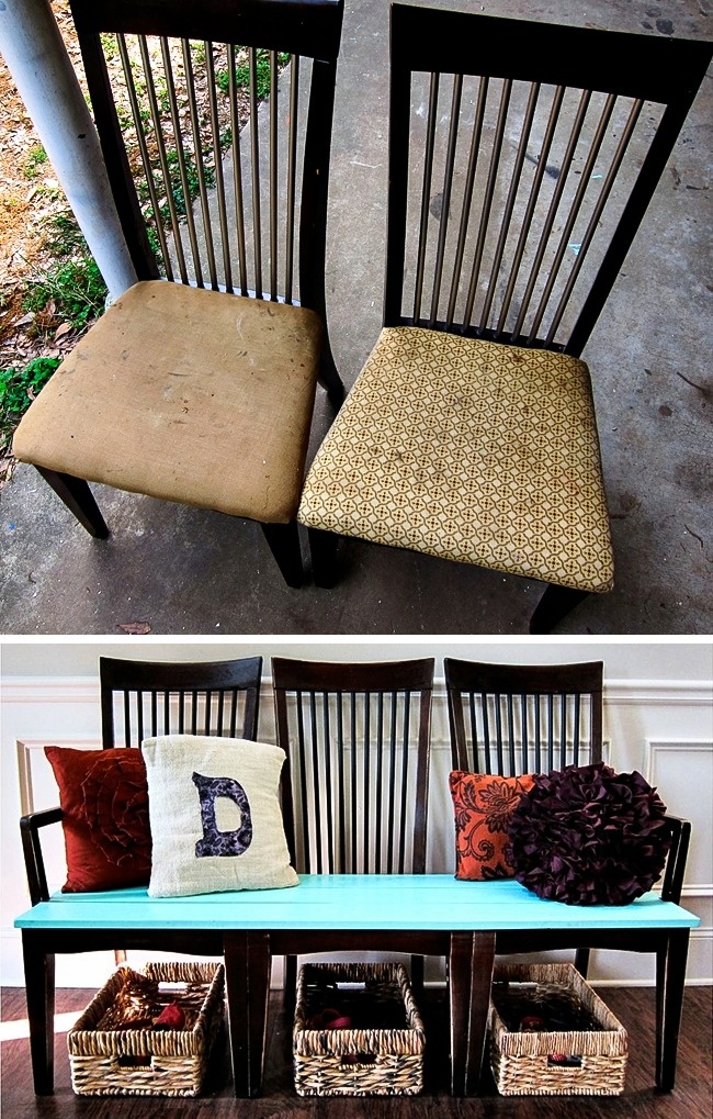 Якщо у вас є кілька непотрібних стільців, можна змайструвати з них зручну яскраву лавку. А тут показано, як це зробити.