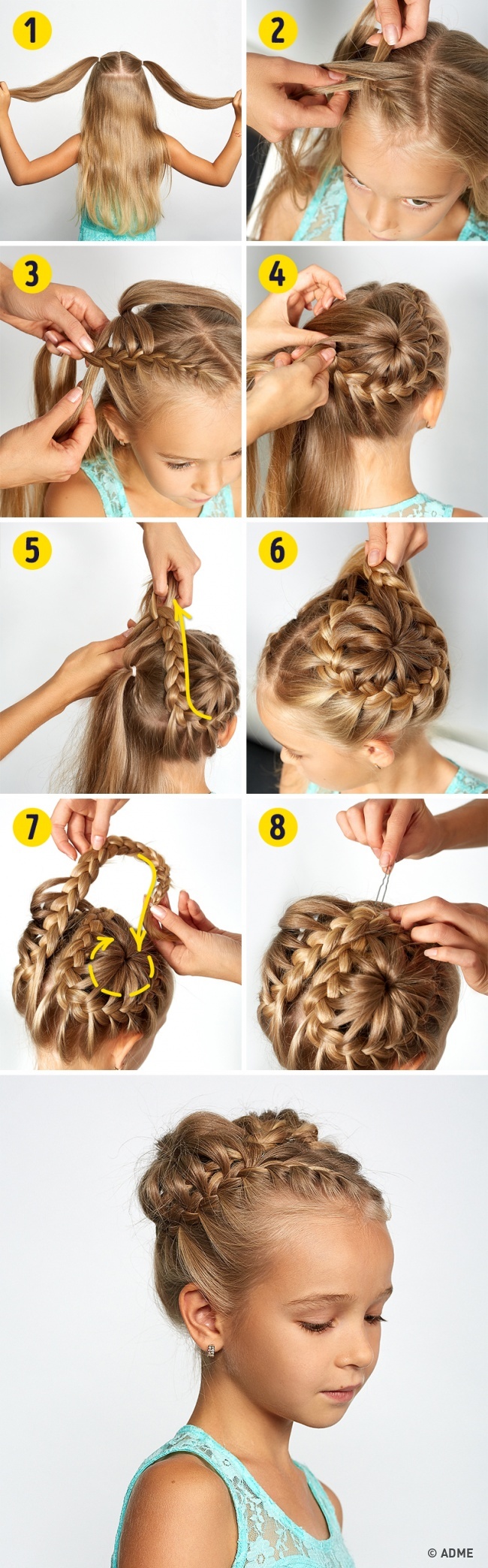 Кіска в цій ніжною і дуже ефектної зачіски проходить вісімкою по всій голові, починаючи від лоба (видно на кроці 5). Кінчик коси ховаємо між пасом першої «ромашки» (крок 7).