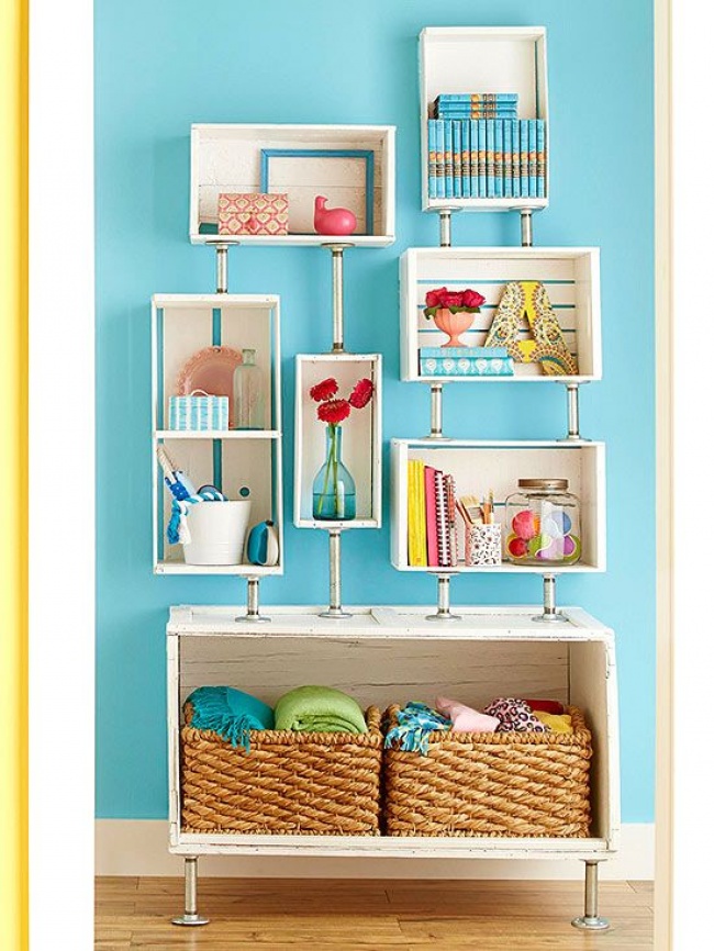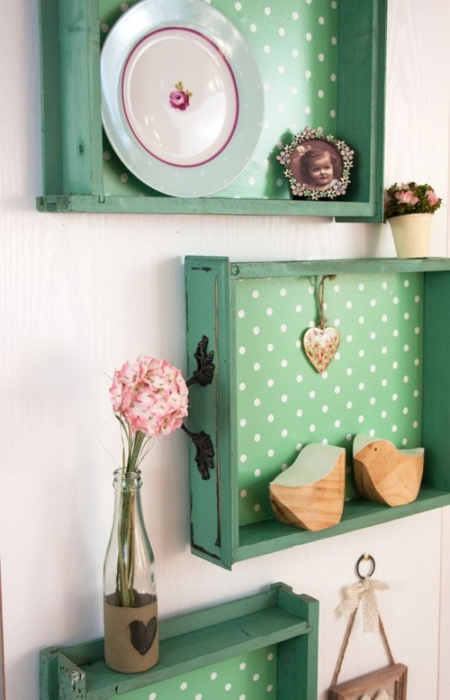 Вийнявши ящики з бабусиної комода і пофарбувавши їх у потрібний колір, ви отримаєте універсальні полиці для кухні. Вони стануть вдалим доповненням до інтер'єру в стилі прованс, кантрі або шеббі-шик.