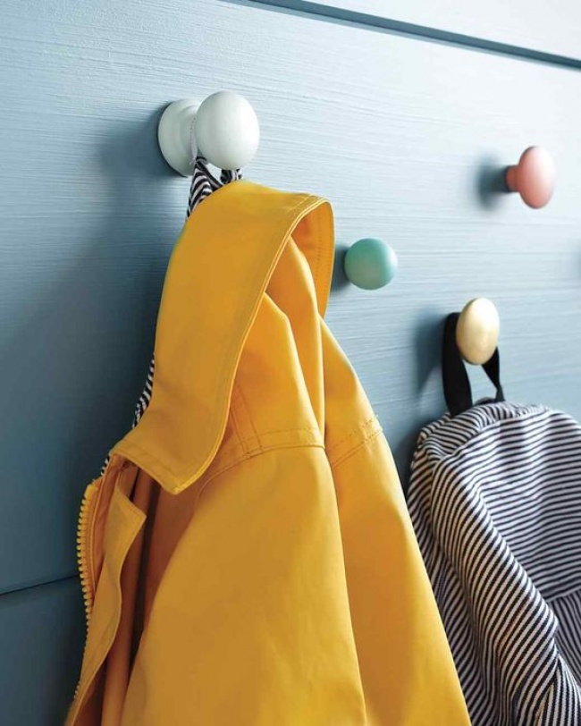 А ось ідея, як різнокольорові ручки від тумбочок можуть замінити гачки в передпокої.