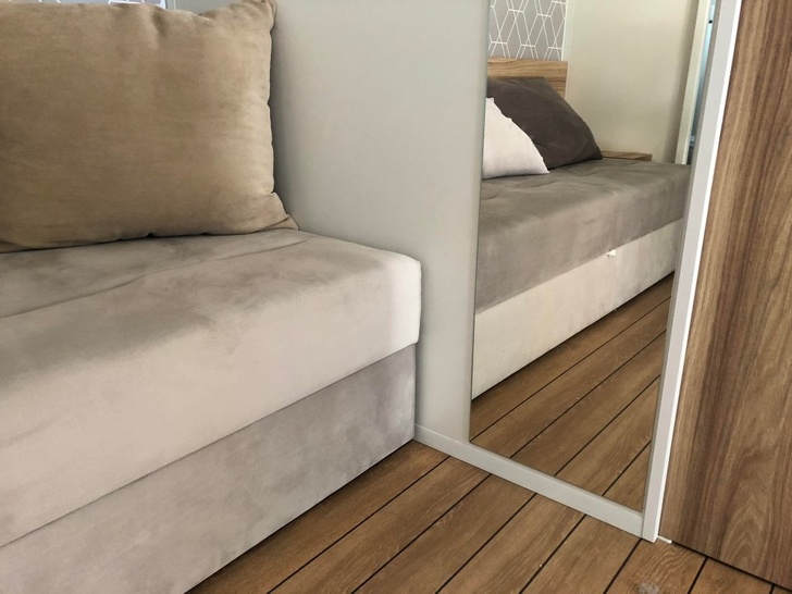 Відтінки кольору замшевого дивана у відображенні дзеркала помінялися місцями