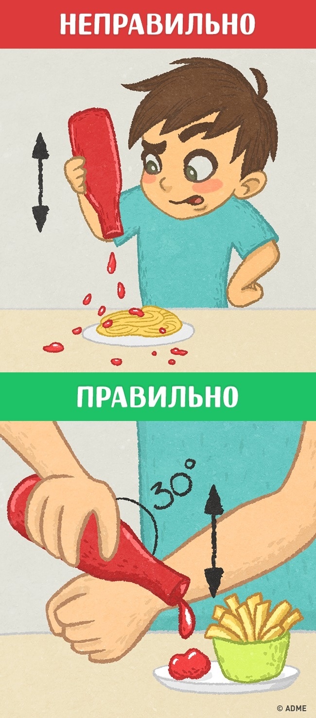 Для цього не треба стукати по денця пляшки. Вам потрібно нахилити пляшку під кутом 30° і легко постукати горлечком по руці. Так кетчуп легко і без бризок витече на тарілку.