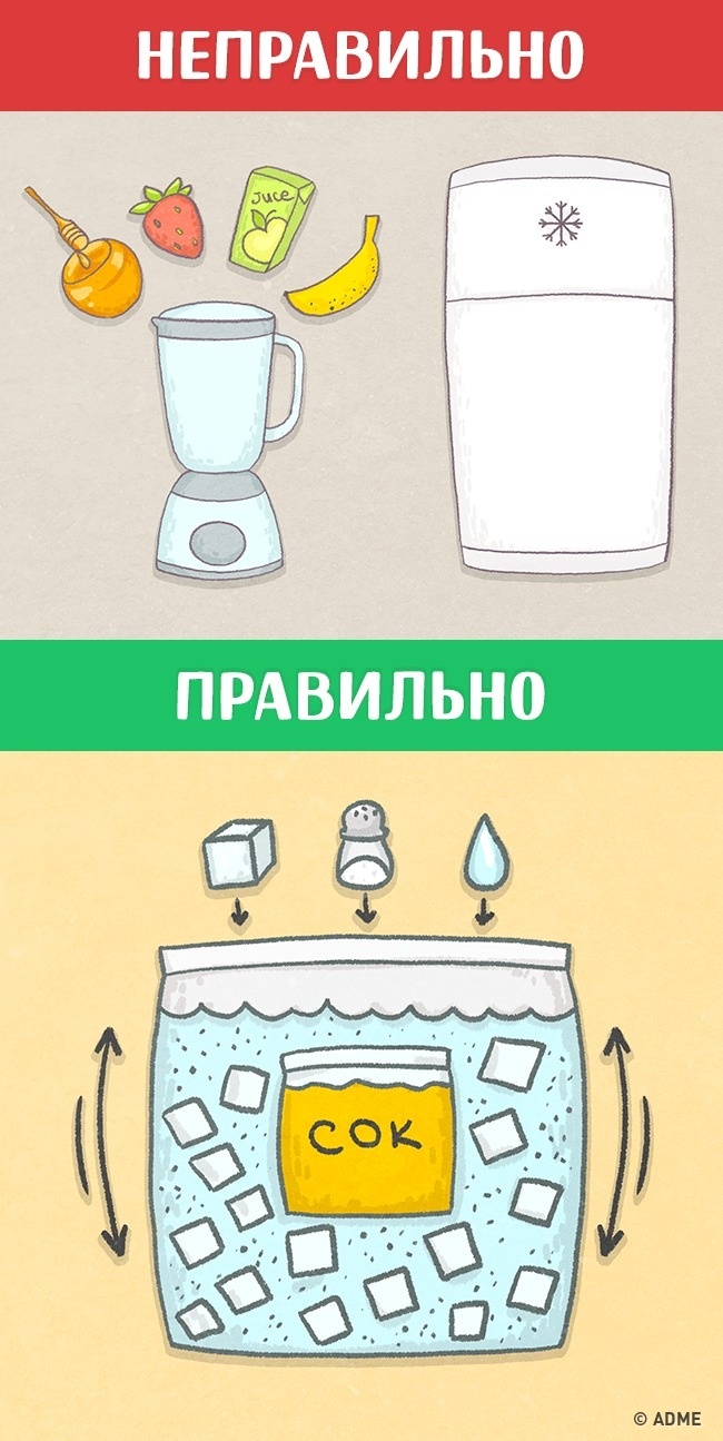 Налийте склянку соку в пакет і герметично закрийте. Покладіть його в пакет побільше. Висипте туди дві склянки льоду, склянка солі і налийте склянку води. Енергійно трусіть, поки сік в пакеті не застигне.