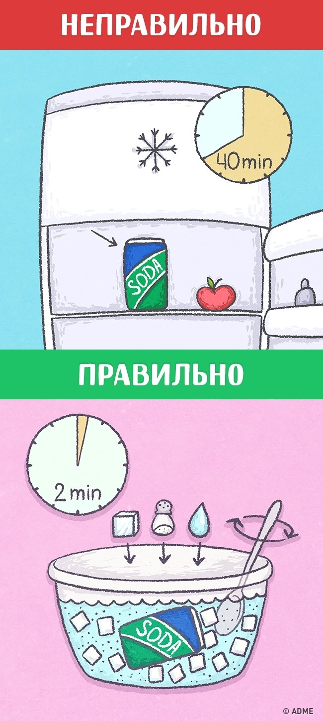 Налийте в тазик води, додайте 2 склянки льоду і склянку солі. Покладіть туди банку газованої води і енергійно перемішувати, поки газована вода не охолоне.