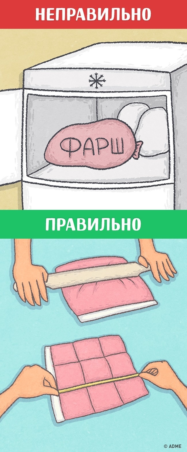Покладіть фарш в пакет і розкачати його качалкою так, щоб він став плоским. Лінійкою, паличкою для суші або звичайним олівцем зробіть поглиблення. Заморозивши фарш таким чином, ви легко зможете відламати потрібний шматочок і швидко його розморозити.