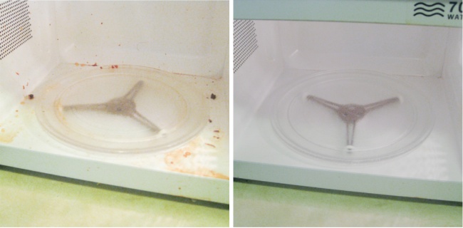 Налийте 1 склянку води у велику ємність і додайте декілька столових ложок оцту. Потім увімкніть мікрохвильовку і дочекайтеся, поки віконце у дверцятах запітніє. Вимкніть і дайте охолонути протягом 15 хвилин, перш ніж відкривати дверцята, потім приберіть посуд і протріть вологою губкою.