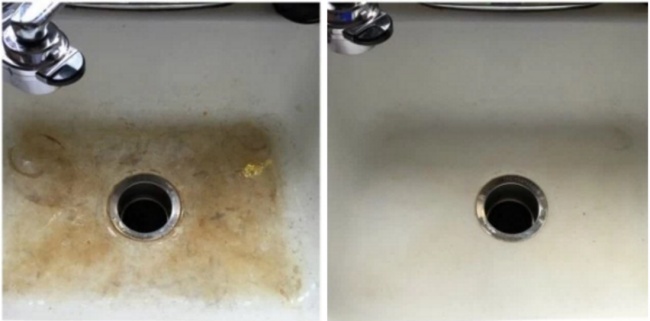 Змішайте 2 ст. л. кальцинованої і 2 ст. л. питної соди в однорідну масу і натріть вологу ванну цією сумішшю. Через 10 хвилин змішайте 50 г оцту і 50 г відбілювача і нанесіть поверх першого шару. Через півгодини обполосніть ванну великою кількістю води.