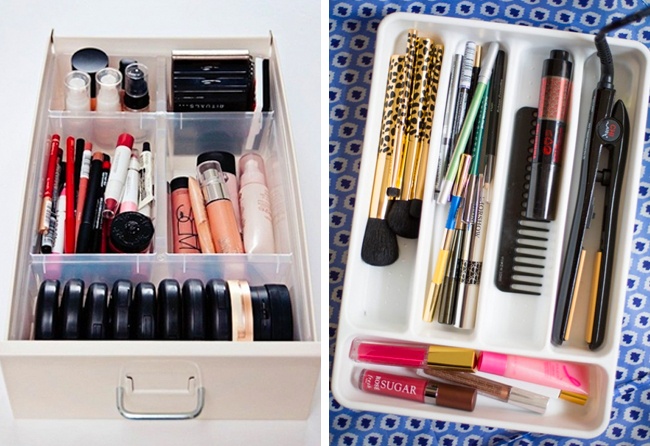 Будь-які довгі косметичні засоби, наприклад блиски для губ, помади, олівці і навіть праску, можна розкласти в спеціальний пластиковий або дерев'яний ящик, який використовують для зберігання столових приладів на кухні. Його можна заховати в висувний ящик письмового або туалетного столика, головне, щоб він підійшов за розміром.