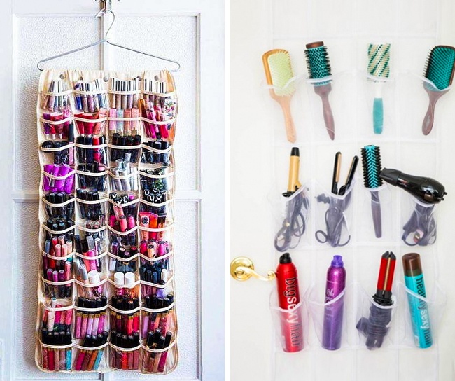 Засоби для укладання волосся, а також гребінці, фени та інші аксесуари для волосся приберіть в органайзер для домашніх капців, який можна прикріпити на двері у ванній.