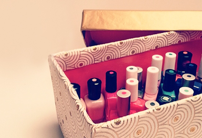 Оформіть звичайну взуттєву коробку, використовуючи обгортковий папір і помістіть в неї лаки для нігтів. Для того щоб швидко орієнтуватися в бутыльках, не забудьте намалювати на ковпачках відтінки лаків. Найпростіше це можна зробити, капнувши краплю лаку з бутылька за допомогою, наприклад, зубочистки.