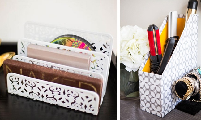 Дівчата, у яких в косметичному арсеналі є професійні палітри тіней, рум'ян або сухих коректорів, можуть використовувати підставки-органайзери для паперів. У них можна поставити також набори кистей для макіяжу. У вертикальному лотку для паперів можна зберігати різні пристрої для волосся: прасування, плойки, щипці.