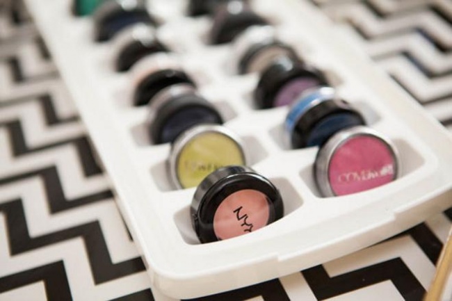 Щоб тіні не губилися, можна скласти їх в спеціальну форму для льоду і прибрати в висувну шухляду туалетного столика. Можна розкласти тіні по кольорам або виробникам, щоб легко знаходити те, що потрібно.