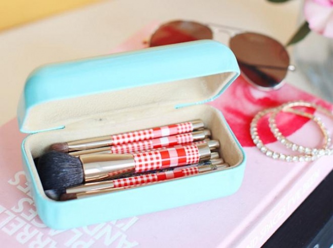 Якщо потрібно взяти пензля з собою в подорож, можна акуратно упакувати їх в старий чохол від сонячних окулярів. Туди ж можна скласти олівці для очей і брів.