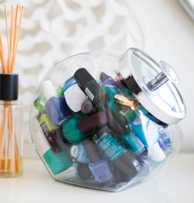 Великі банки для сипучих продуктів — найкраще місце зберігання лаків для нігтів. Лаки більше не будуть захаращувати косметичку і порошитися в коробках. Складіть їх в одну велику скляну банку для круп, закрийте кришкою і насолоджуйтеся порядком.